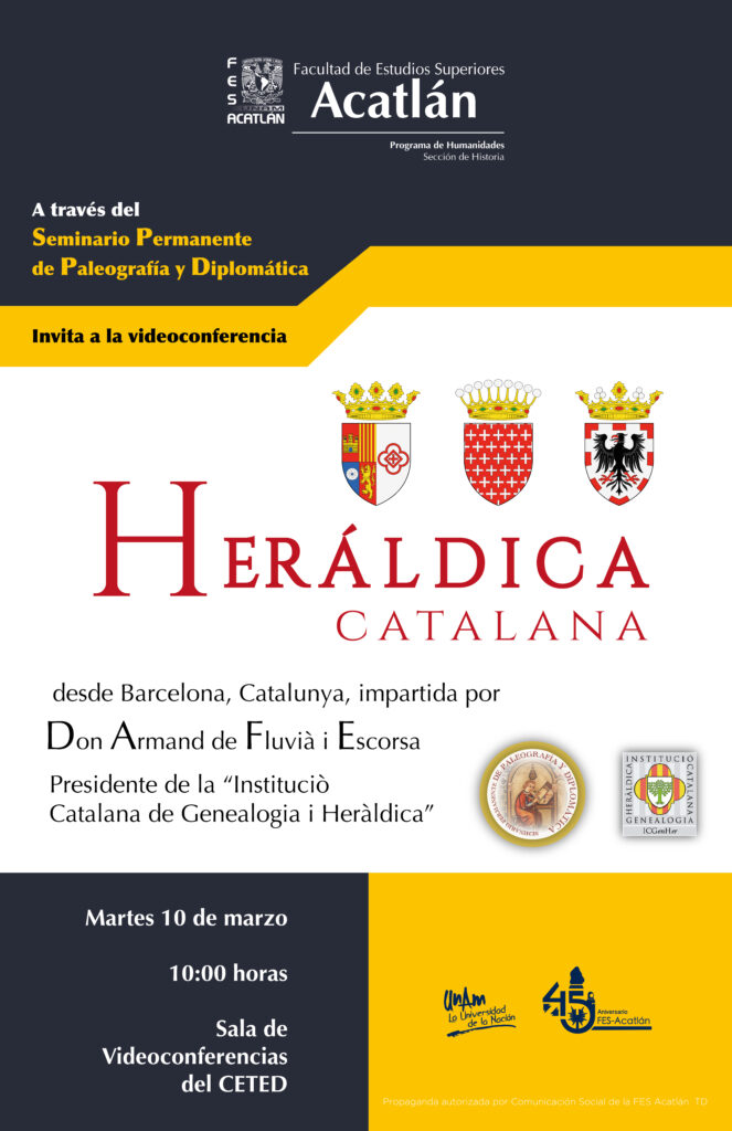 El passat divendres 27 de març a les 10:00 hores, a la Ciutat de Mèxic (17:00 hores a Barcelona), Armand de Fluvià i Escorsa, president de la Institució Catalana de Genealogia i Heràldica (www.ICGenHer.cat), es va impartir, una vídeo-xerrada “Heráldica catalana” a un grup d’alumnes de la carrera d’Història de la Facultat d’Estudis Superiors Acatlán, UNAM de Mèxic.