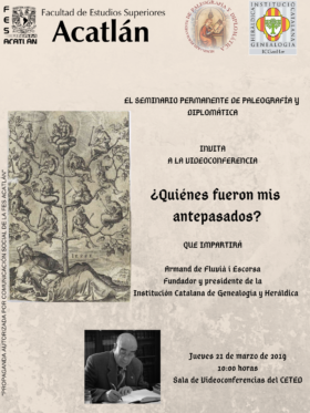 El passat divendres 27 de març a les 10:00 hores, a la Ciutat de Mèxic (17:00 hores a Barcelona), Armand de Fluvià i Escorsa, president de la Institució Catalana de Genealogia i Heràldica (www.ICGenHer.cat), es va impartir, una vídeo-xerrada “Heráldica catalana” a un grup d’alumnes de la carrera d’Història de la Facultat d’Estudis Superiors Acatlán, UNAM de Mèxic. Vídeo-conferència: Heràldica catalana d’Armand …